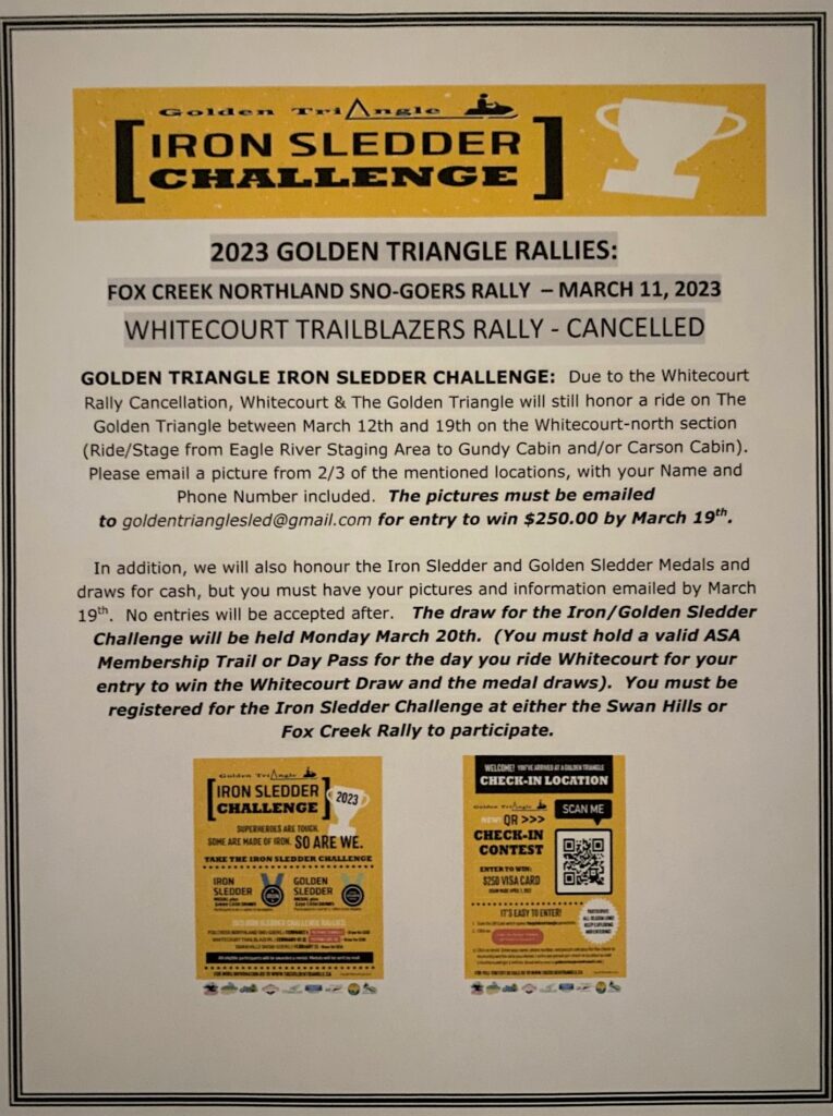 Don’t forget to pickup an annual ASA Membership Pass or Day Pass if you are heading out to ride.  They are available at Adrenaline Powersports, RPM Powersports, Whitecourt Service Centre, IGA-Whitecourt and First Choice Truck and Carwash.  $90 – Trail Pass and $25 Day Pass.  Also available online at http://www.whitecourttrailblazers.ca