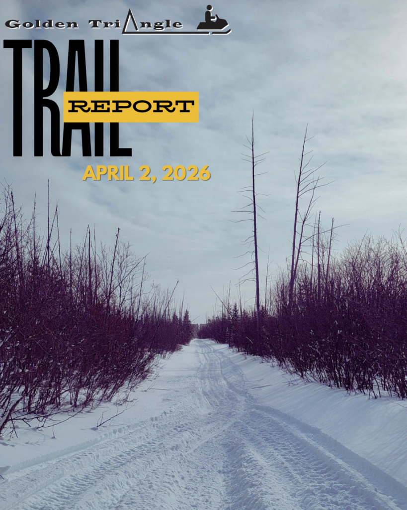 – – – Starting after the long weekend, The Swan Hills Snow-Goers will be shutting down a small section of the Golden Triangle for trail maintenance; Users will be rerouted through a different section of the Swan Hills trail system. Golden Triangle re-route signs will be up with trail maps to make things easier for riders to navigate.